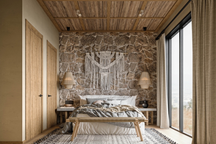 从公区客厅、休闲吧台、客房、卫浴到收纳区,整体主打现代侘寂自然风,摒弃繁杂冗余装饰,只用干净利落的线条、温润沉稳的配色、原生质感的材料,营造远离喧嚣、松弛治愈的入住体验,让旅客踏入民宿的瞬间,就能卸下所有疲惫。