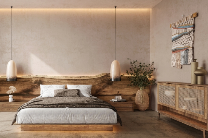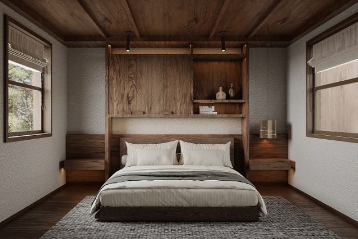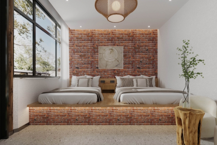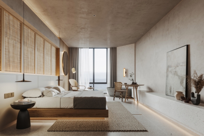 全屋大面积采用哑光微水泥墙面工艺,一体成型无缝施工,肌理细腻柔和,质感高级百搭,防潮耐磨、抗污易打理,完美适配民宿高频次入住使用,常年使用也不易显旧。