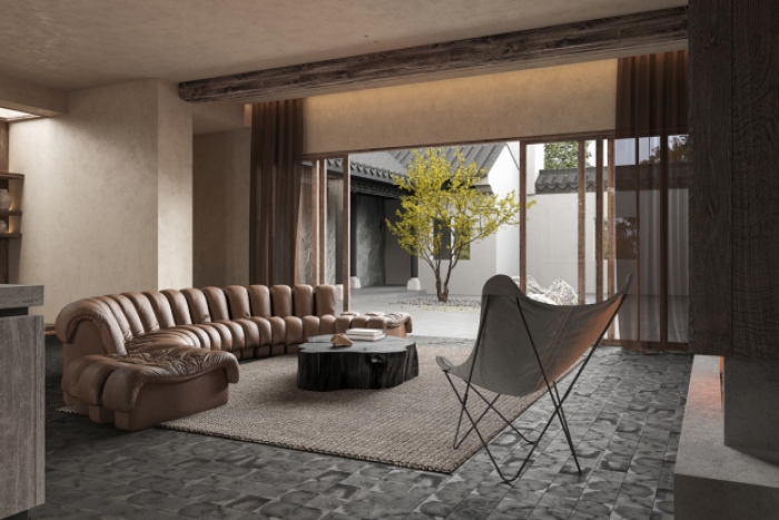 顶面搭配深色实木横梁与弧形吊顶工艺,原木天然纹理清晰温润,精准拼接打磨,结构稳固扎实,为空间增添厚重温暖的底色;地面通铺大尺寸哑光仿古砖,脚感温润、防滑耐磨,打理清洁省时省力。