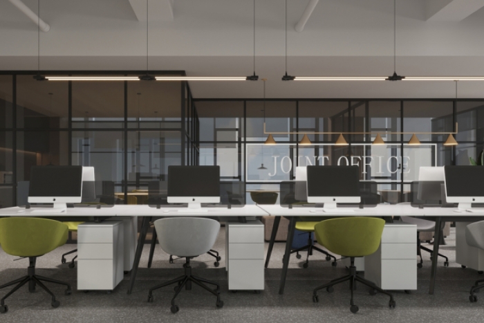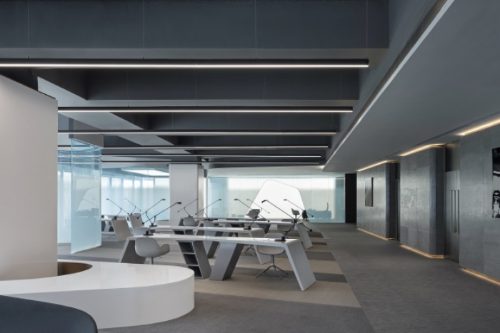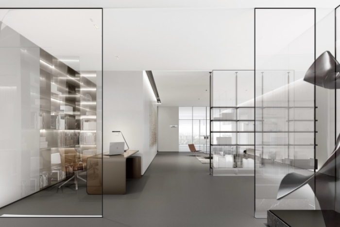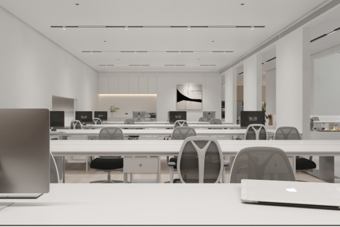 开放办公区:现代简约风格,玻璃隔断 + 线性吊灯,通透高效,提升协作效率。