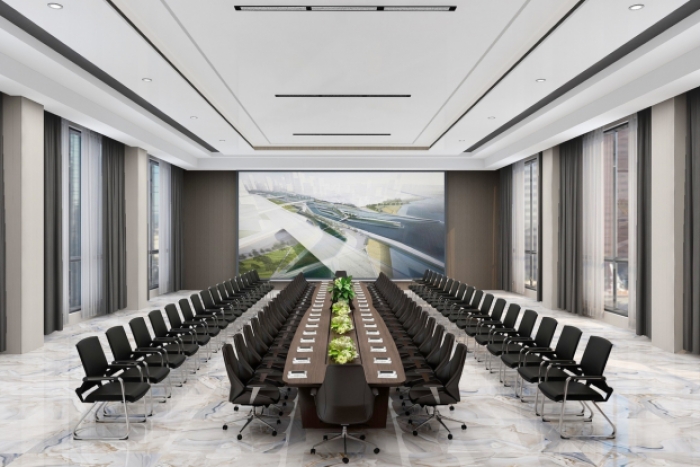 高管总裁室:原木极简风,全景落地窗 + 悬浮吊顶,静谧沉稳,彰显商务格局。