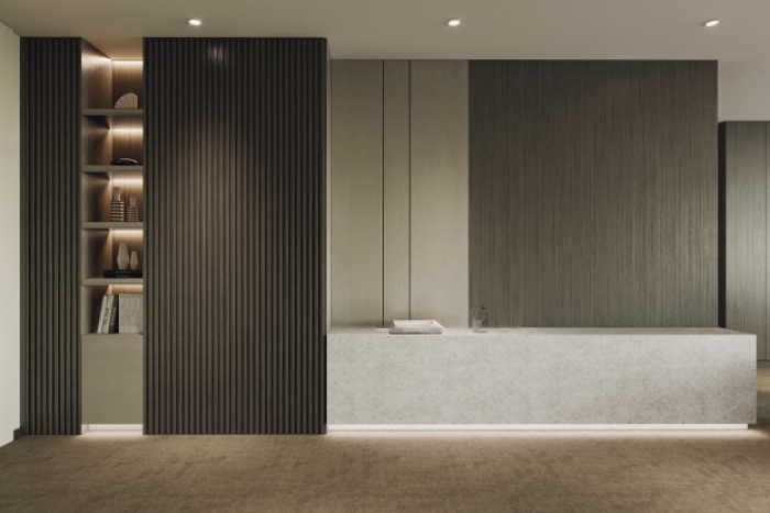 本案整体采用现代极简侘寂轻奢风格,低饱和度柔和配色,利落干净的线条设计,高级百搭又耐看,适配多种工作室、私人会所、接待办公场景使用。